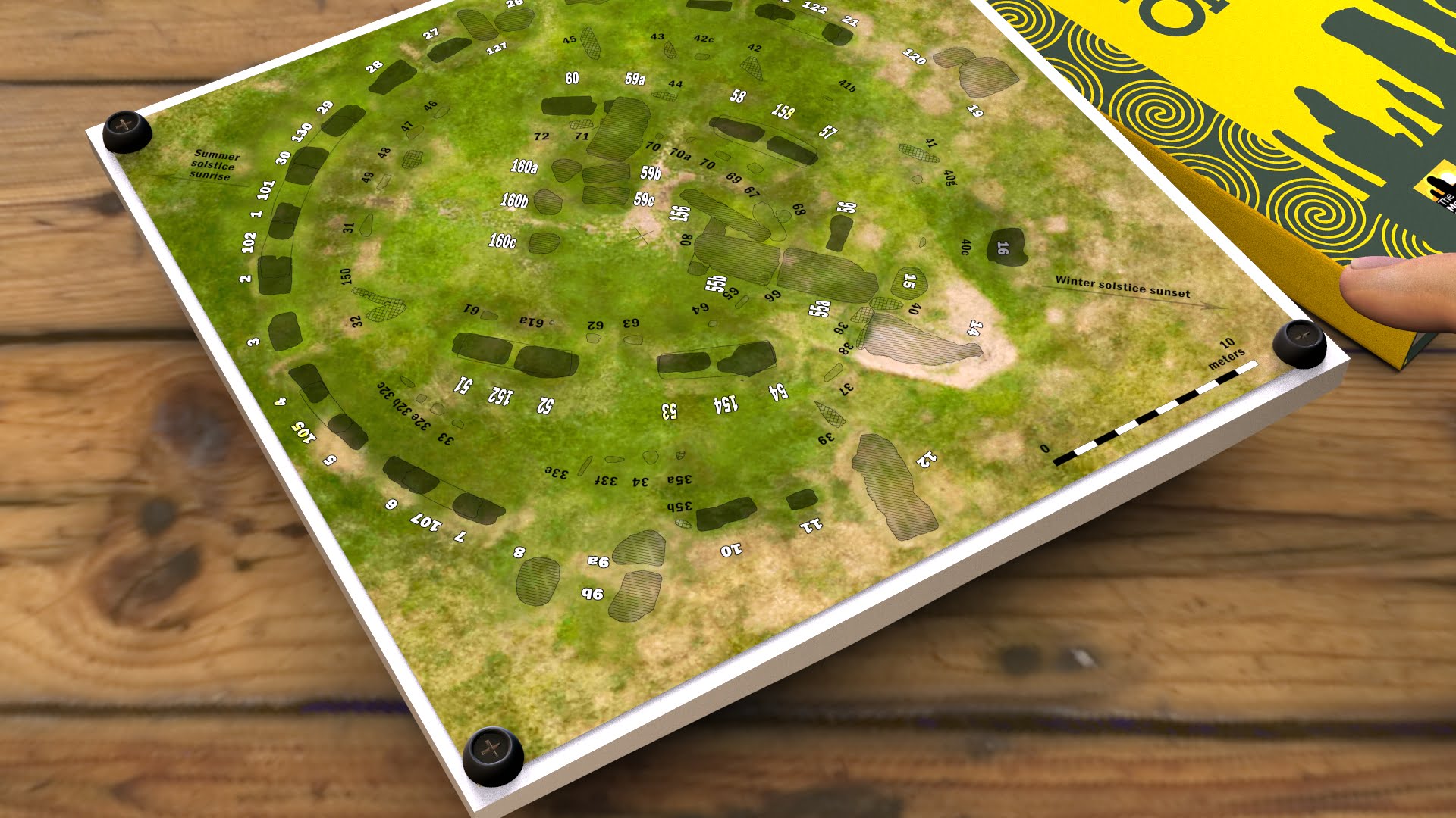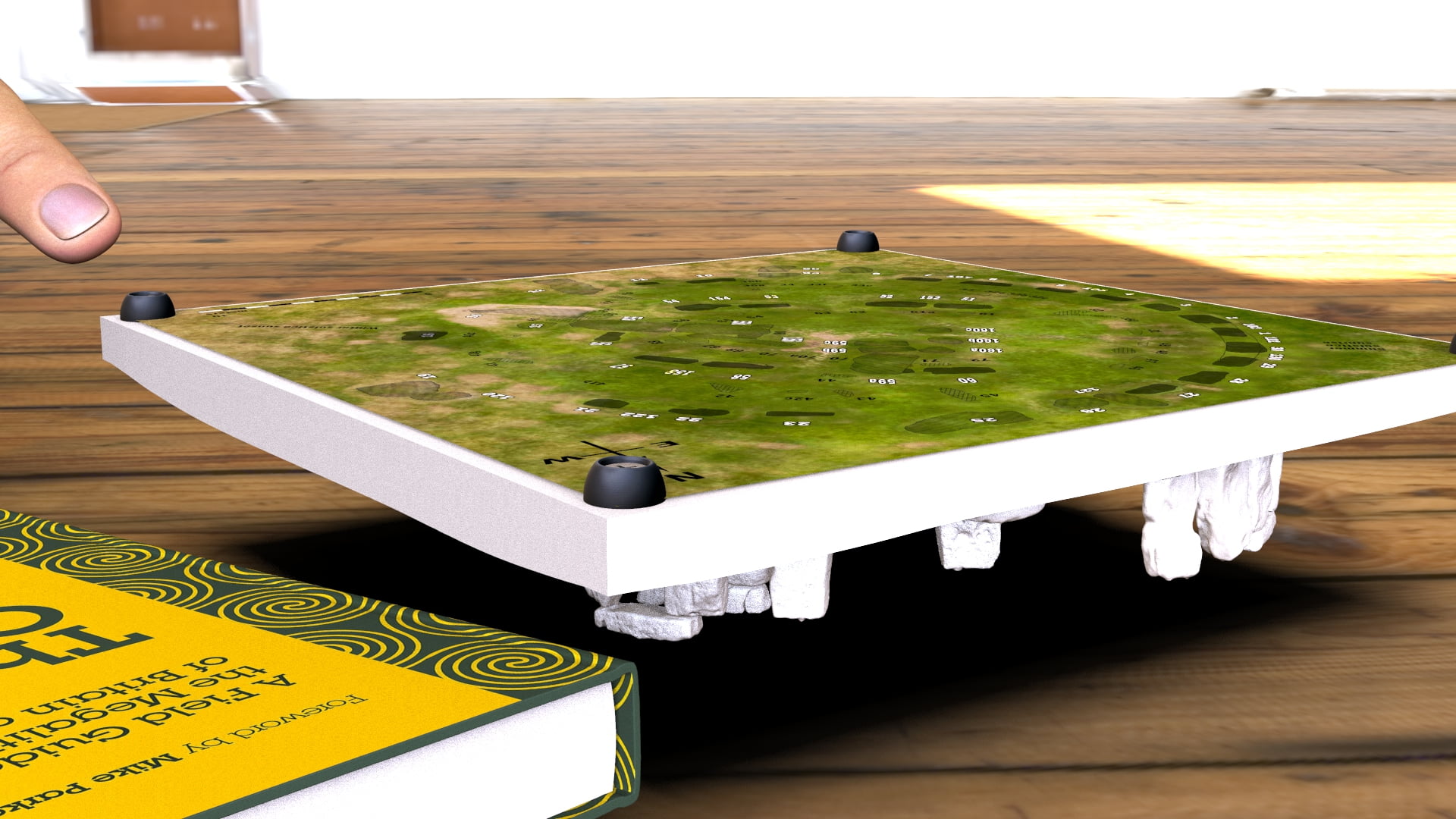 Stonehenge 200th scale model framed, glazed and hanging on a wall. Bluestones are iron blue coloured, sarsens are off-white while the base has an aerial photograph showing the parch marks where the missing stones once stood. The numbered plan would be fixed to the rear and a spare stored close by.